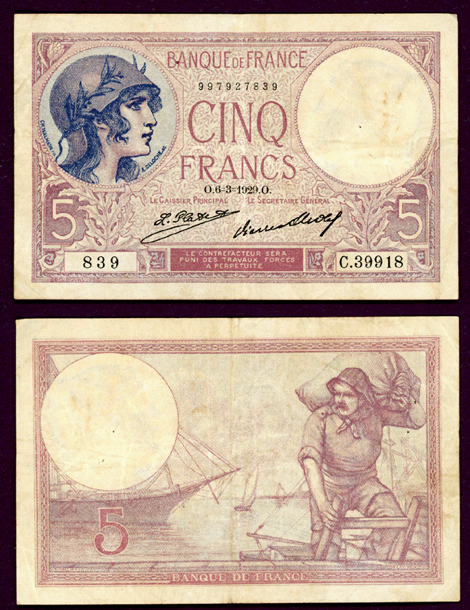 Item Number: F-100 Very Fine - #72D Dated 6-3-1929 - Woman wearing helmet at left with watermark of woman's head at right. Dock worker or sailor with sailing ships on back. This is the signature combination of L. Platlet & P. Strohl.$25.00