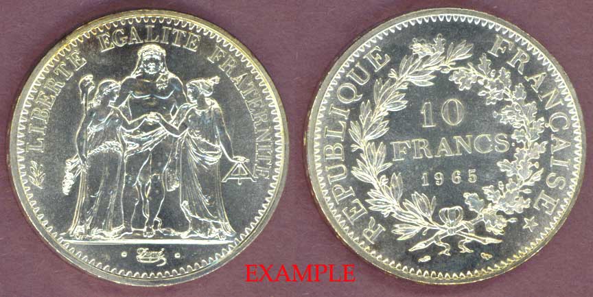 Uncirculated - 10 Francs #932 .900 Silver - Hercules at center. Large silver dollar size coin about 37 MM.