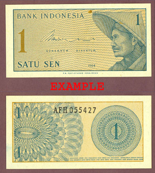 Item Number: INDO-23E Crisp Uncirculated - #90 Small size note 4" X 2" Front is green-blue with peasant in straw hat at right. Back is same color with serial #.$1.00