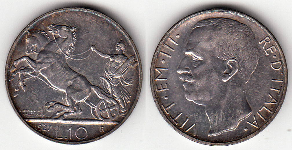 Item Number: IT-35 Extremely Fine - 10 Lira KM-68.1 .835 Silver. Female in chariot with two horses. Head left of ruler: Vittorio Emanuele III. No problem original surfaces with excellent luster remaining. Almost the size of a US half dollar.$95.00
