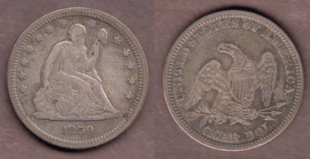 Item Number: SLQ-242 Very Fine+ No-Motto Seated Liberty quarter. High grade VF with original uncleaned surfaces. Mintage of 1,343,200$100.00