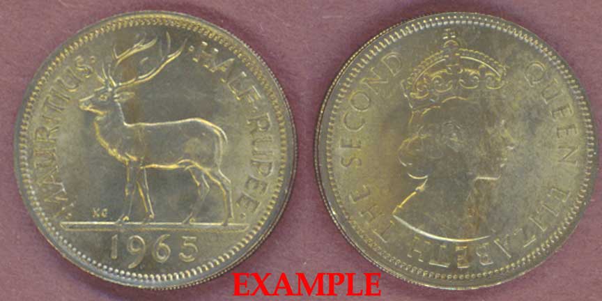 Item Number: MAUR-28E Uncirculated - 1/2 Rupee KM-37.1 Copper-Nickel - Queen Elizabeth II. Stage above date. Mintage of Only 200,000$8.00