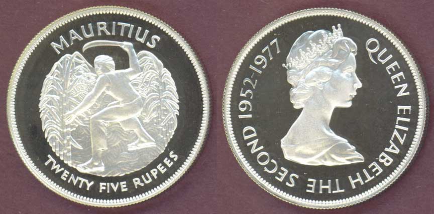 Item Number: Maur-25 Proof - 25 Rupees #43A .925 Silver With Man harvesting sugar cane. Large silver dollar size coin. Low mintage of 47,000$100.00