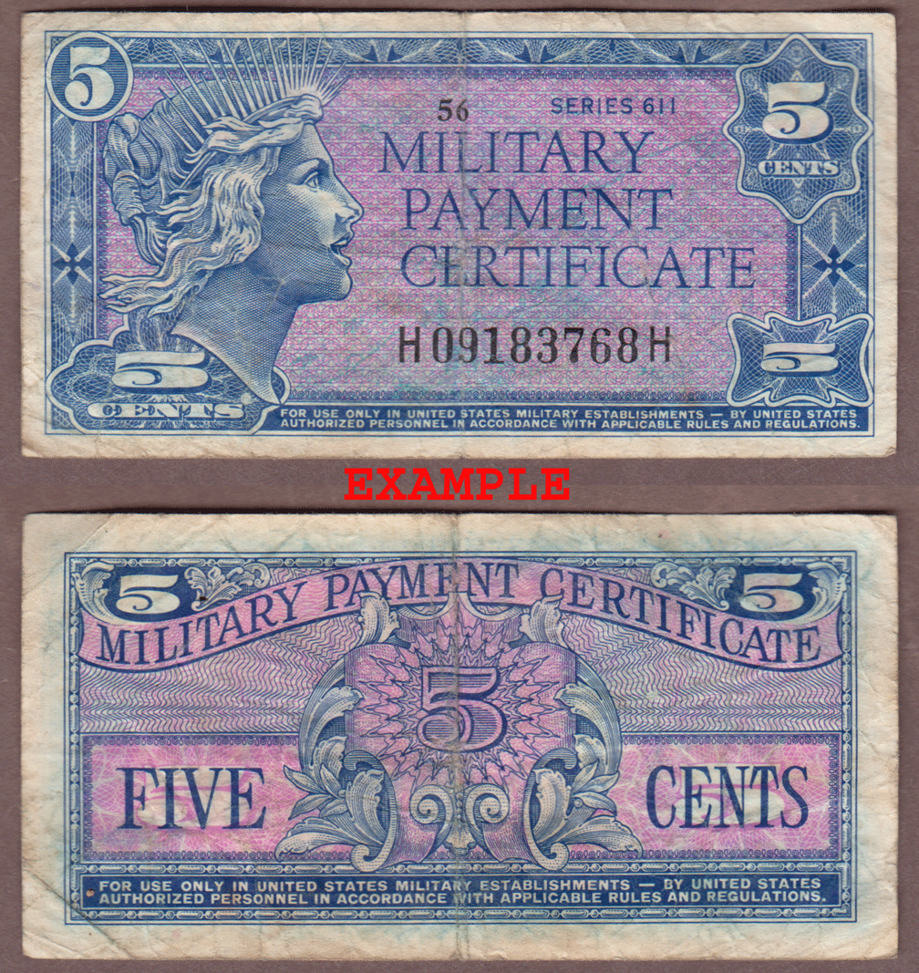 Item Number: MPC-241E Fine or Better - Issued 1-06-64 to 4-28-69 Blue with multicolored underprint Liberty at left, Blue/Violet back.$12.00