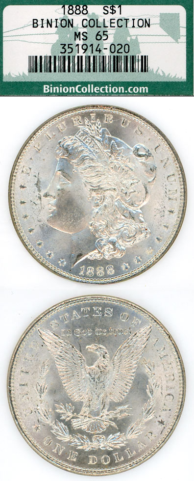 Item Number: MD-1494 1888 NGC Mint State 65 "Binion Collection" - NGC has certified this 1888 $ is from the famous Las Vegas silver dollar hoard of Lonnie (Ted) Binion. Original brilliant white silver dollar.$335.00