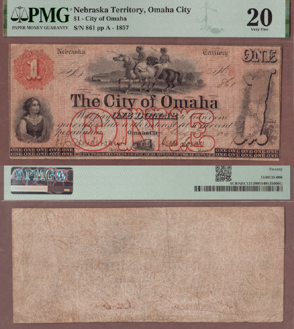 OBN-128 PMG Very Fine 20 - Nebraska Territory - The City of Omaha - Sept 1st 1857 - Great note from before Nebraska became a State. Two Indians on horseback watching train in background at center. Woman at lower left with large red ONE overprint at lower center. Uniface note. Printed by Wellstood, Hay and Whiting - New York