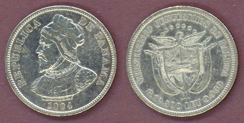 Item Number: PAN-32 Extremely Fine - 25 Centesimos #4 .900 Cleaned at one time. About the size of a US half dollar. Bust of Balboa. One year type coin.$65.00
