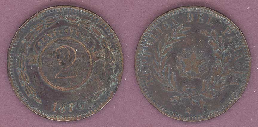 Item Number: Para-24 Very Fine - 2 Centesimos #3 Copper - Made only one year. Coins of the 1800's from Paraguay are harder to find.$20.00