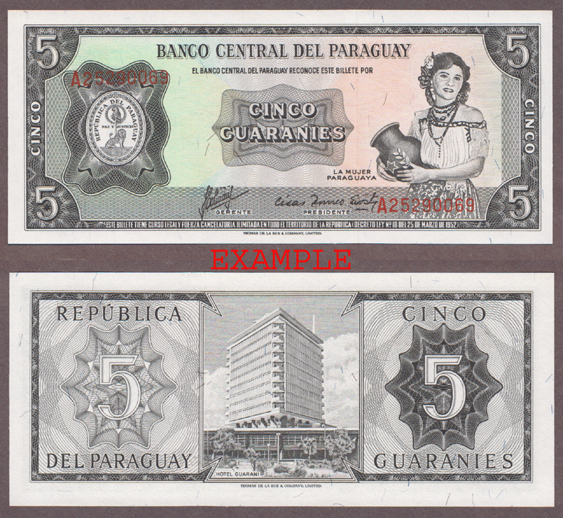 Uncirculated - #195 Front is Black on multicolored underprint with girl holding jug at right. Back - Hotel Guarani