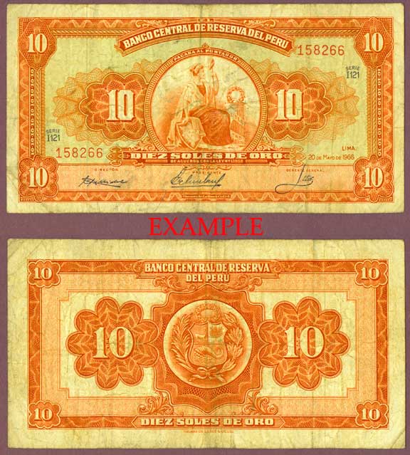 Item Number: PERU-49E Very Good or Better - #84 Note is 6" X 3". Orange on multicolored underprint. Liberty seated with shield and staff. Coat of arms on back.$2.00