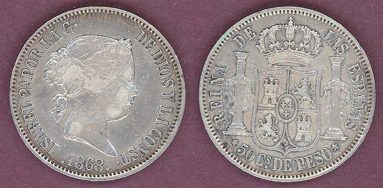 Item Number: PH-41 Very Fine+ 50 Centavo #147 Silver - Nice detail remains on this early Philippines 50 Centavos. This type was made for only 4 years 1865-68$60.00