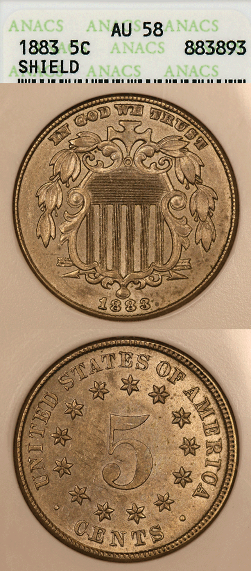Item Number: SN-107 ANACS About Uncirculated 58 - Great strike with fully separated shield lines and all stars fully detailed. Last year for the Shield 5c. Mintage of 1,451,500$165.00