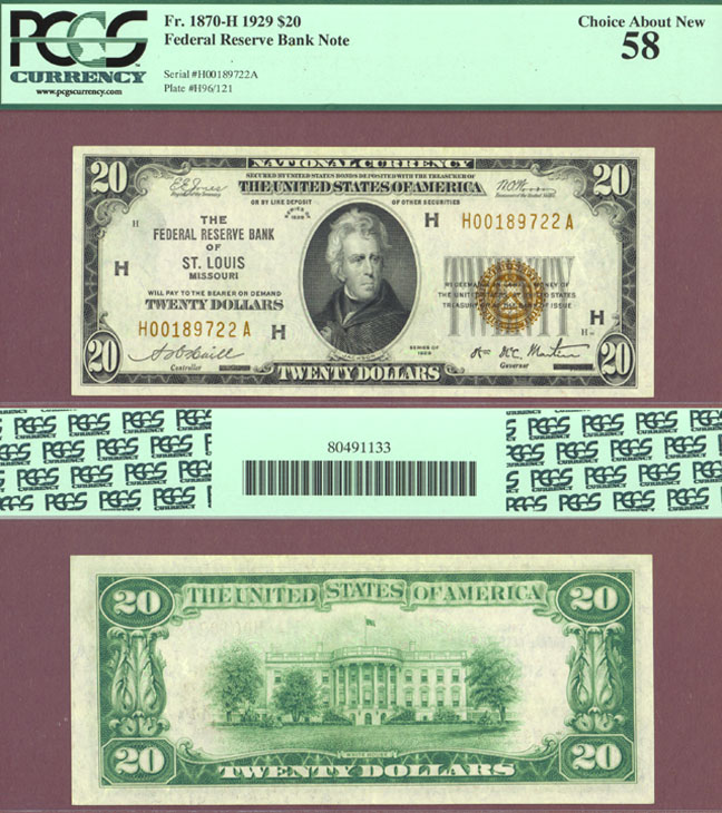 Item Number: SFRBN-57 PCGS Choice About Uncirculated 58 PPQ - FR-1870-H - Beautiful crisp note that has no folds etc... well centered from the St.Louis district. Only 444,000 notes made. $195.00