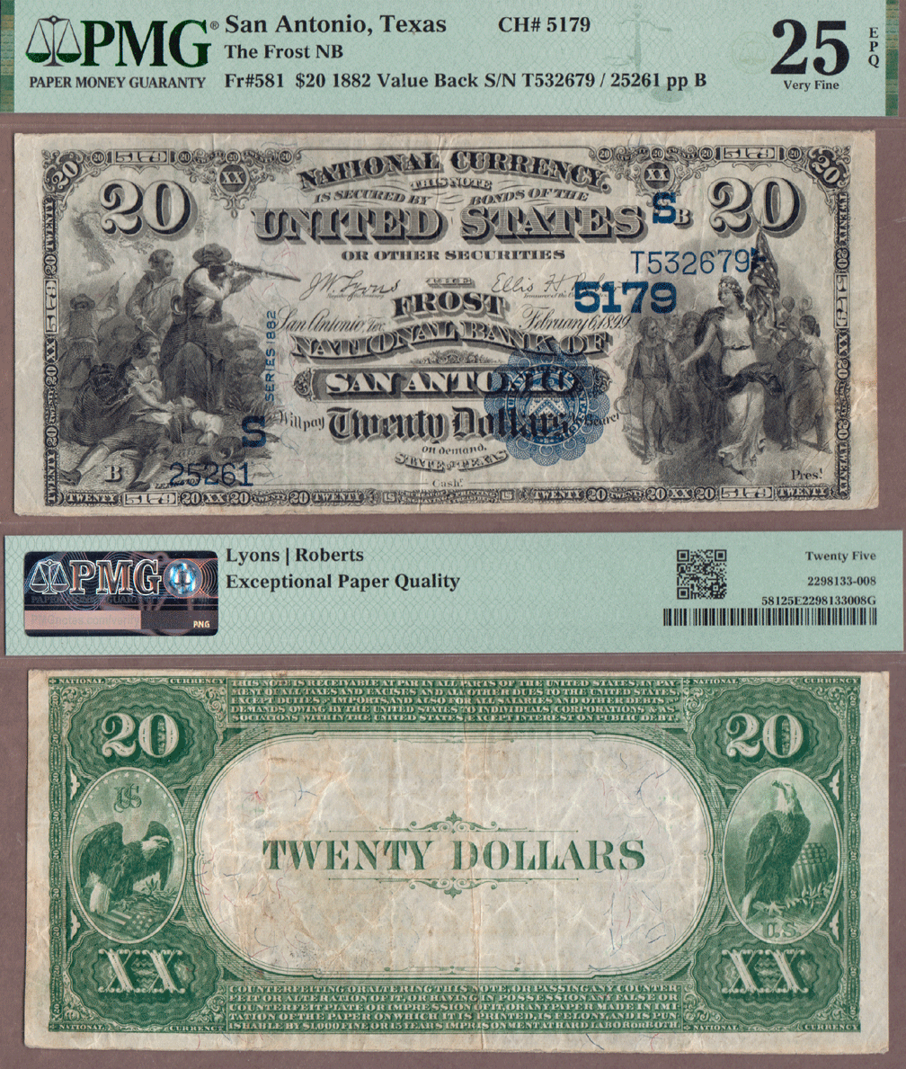 LNBN-119 PMG Very Fine 25 EPQ - FR-581 Signatures of Lyons/Roberts - The Frost National Bank of San Antonio Charter # 5179. $20.00 1882 Value Back Large Size National Bank Note from the Alamo City. Nice margins and Exceptional Paper Quality "EPQ". This is the only $20 1882 Value Back known in the Track&Price census. The note offered here previously sold in 2010 for over $4700 Front - At Left The Battle of Lexington August 19, 1775. At right Columbia leading procession. Green Back with eagles on both sides.
