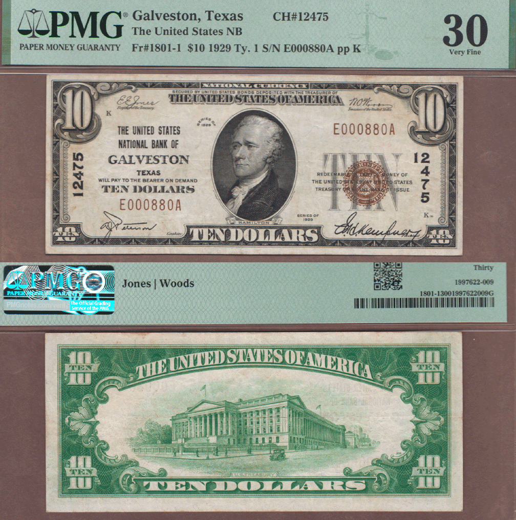 PMG Very Fine 30 - FR-1801-1 - The United States National Bank of Galveston - Charter 12478. Solid mid grade example of this popular Gulf Coast town. 3 digit serial number.