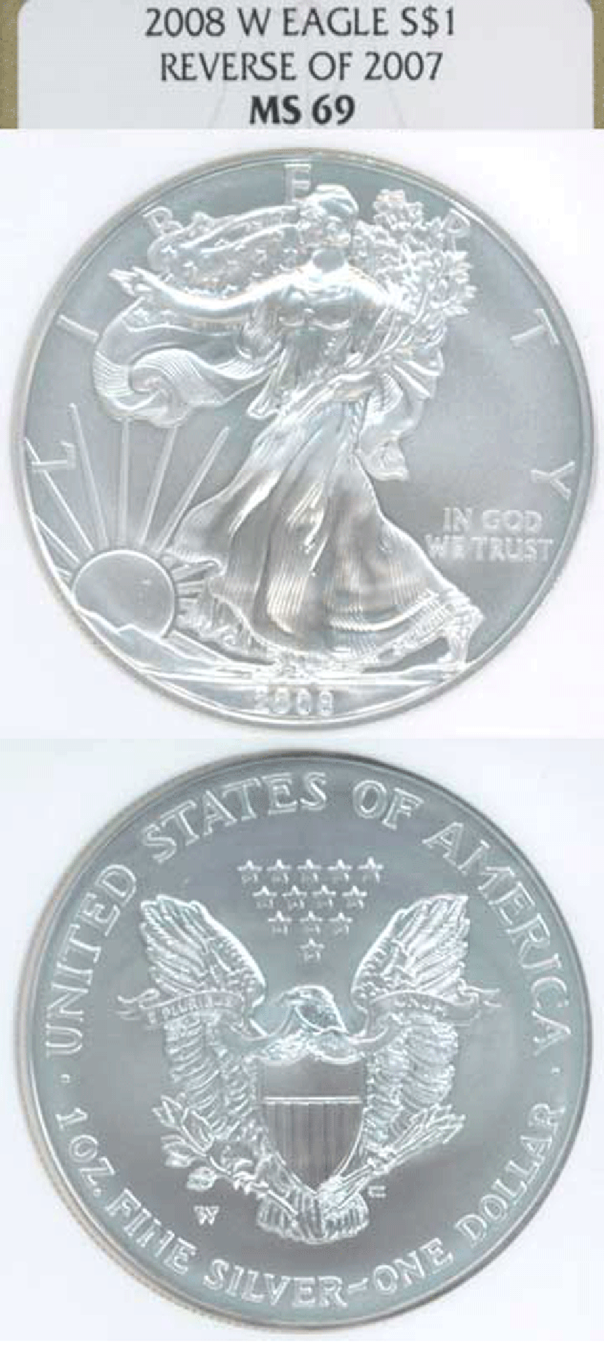 Item Number: SE-56... NGC MS 69 - 2008-W Silver Eagle, Reverse of 2007. One of the KEY Dates. Estimated mintage of 47000 pieces.$495.00