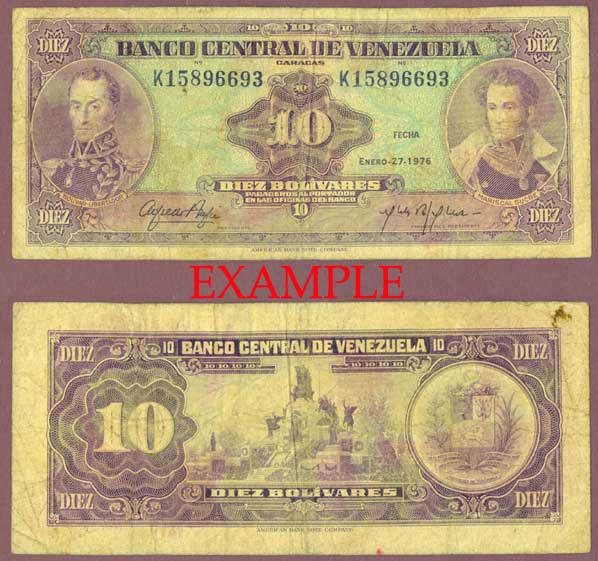 Item Number: VEN-29E Very Good or Better - Purple on green and lilac underprint. Portrait of A. J. de Sucre on right and Simon Bolivar on left. Back has Coat of Arms on right and Monument to Battle of Carabobo at center.$2.00