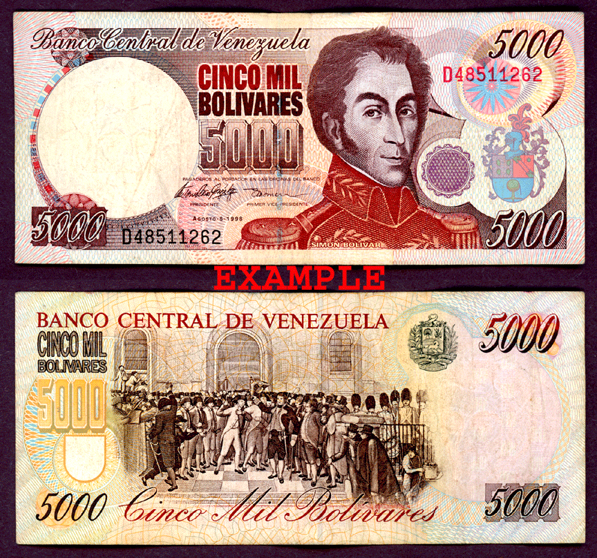 Item Number: VEN-51E Fine or Better - #78 Brown and Red-Brown on multi-colored underprint. Portrait of Simon Bolivar on right and as watermark at left. Back - Gathering at Palace for Declaration of Independence.$6.00