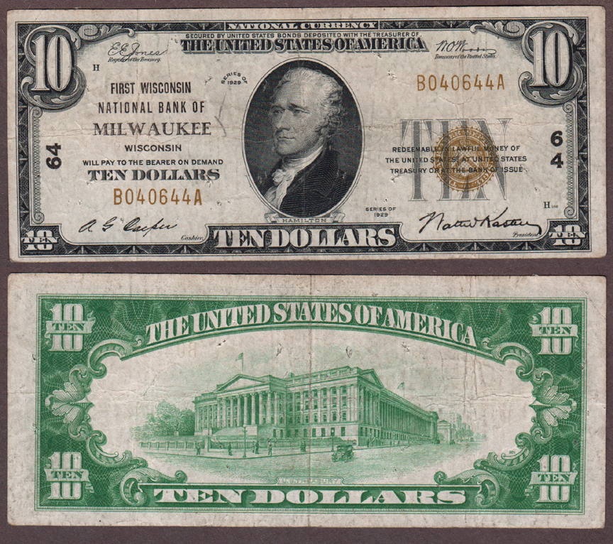 1929 $10.00 Type 1 FR-1801-1 Milwaukee Wisconsin Charter 64